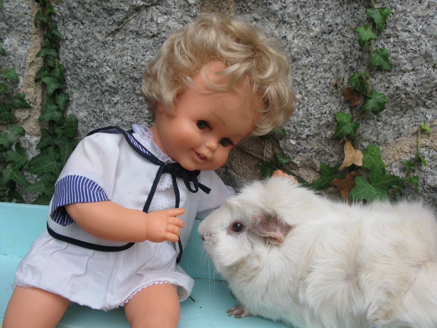De gauche à droite : Chouchou de Raynal, le cochon d'Inde Gribouille et un poupon Raynal brun identique à Chouchou mais sans les dents et sans le mécanisme électrique.
